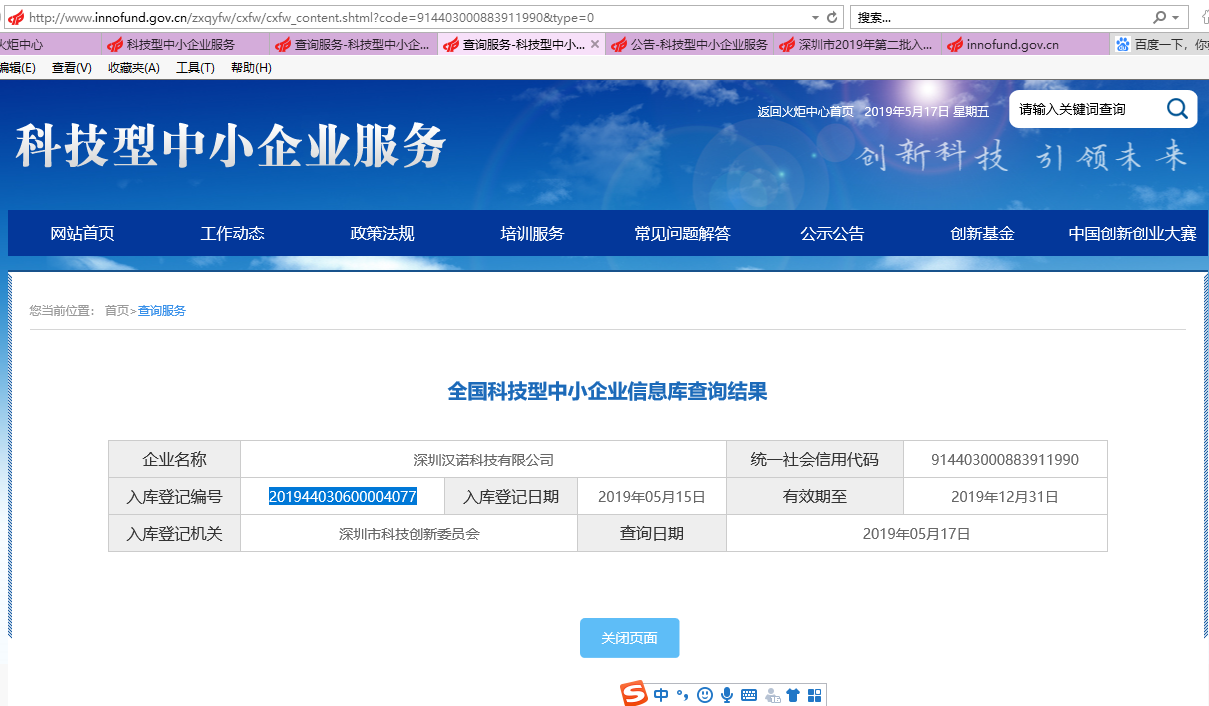 深圳汉诺科技有限公司被评为“全国科技型中小企业”,编号201944030600004077